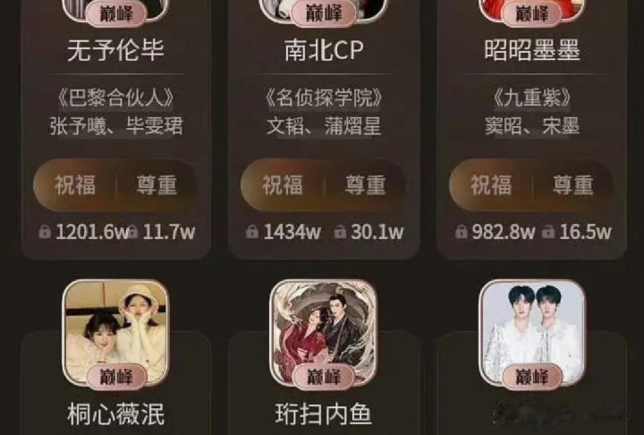位居TOP2的是《巴黎合伙人》中的无予伦毕CP,由张予曦和毕雯珺组成。这部剧以浪漫的巴黎为背景,张予曦和毕雯珺在剧中饰演的角色之间有着跌宕起伏的爱情故事。他们在剧中的每一次相遇、相知、相爱,都让观众感受到了爱情的美好与甜蜜。他们的表演细腻而真实,赢得了观众的喜爱,最终获得了1201.6万票。